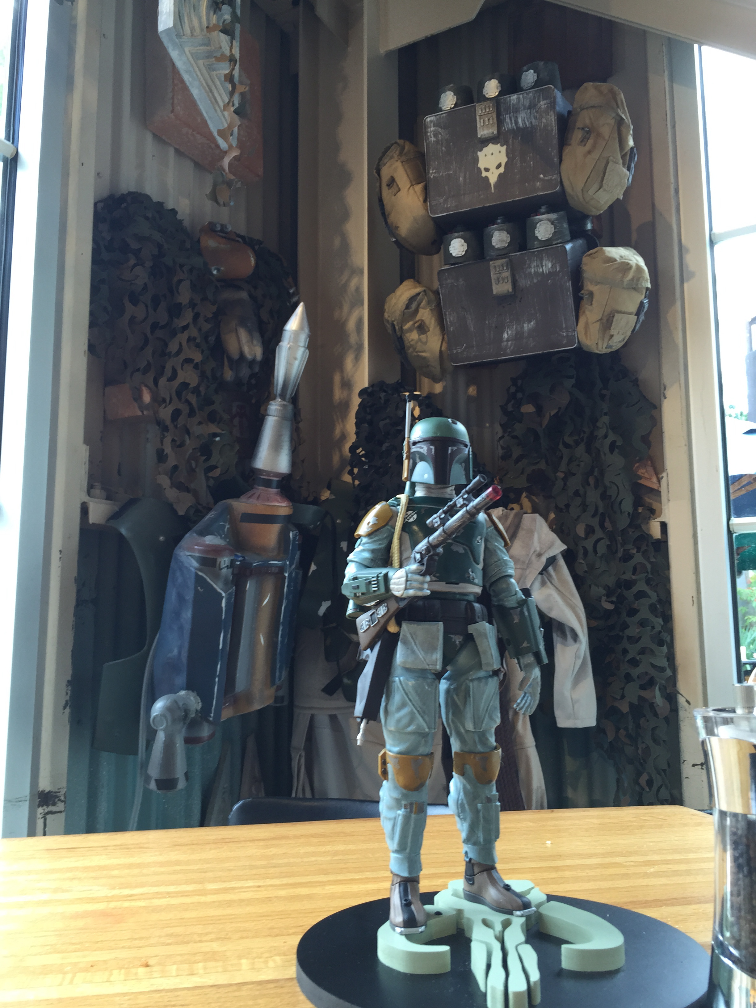 The nice thing about sitting outside was we got a table where we could see the Jedi Training shows that take place every 30 minutes, so we had music and a show. There is some themed decor outside and there was a nice breeze so we were happy. Inside, there is a huge amount of theming and decor. Each table has a figurine like Boba Fett, R2-D2 or an AT-AT. Make sure you take the time to walk around to look at the details.