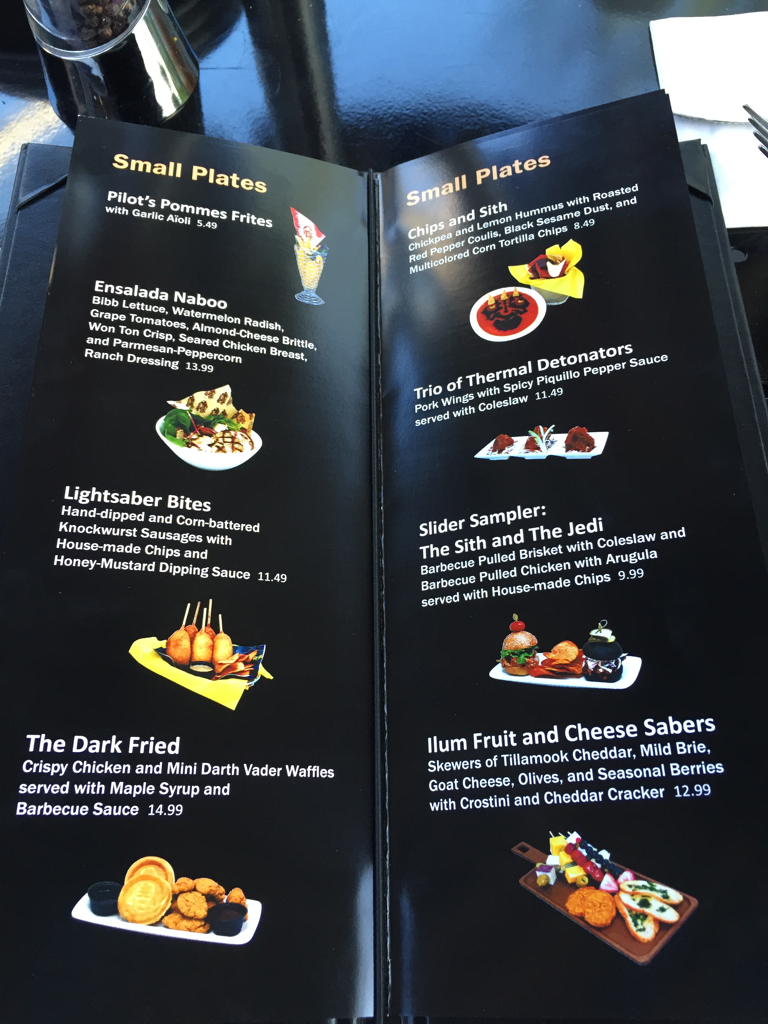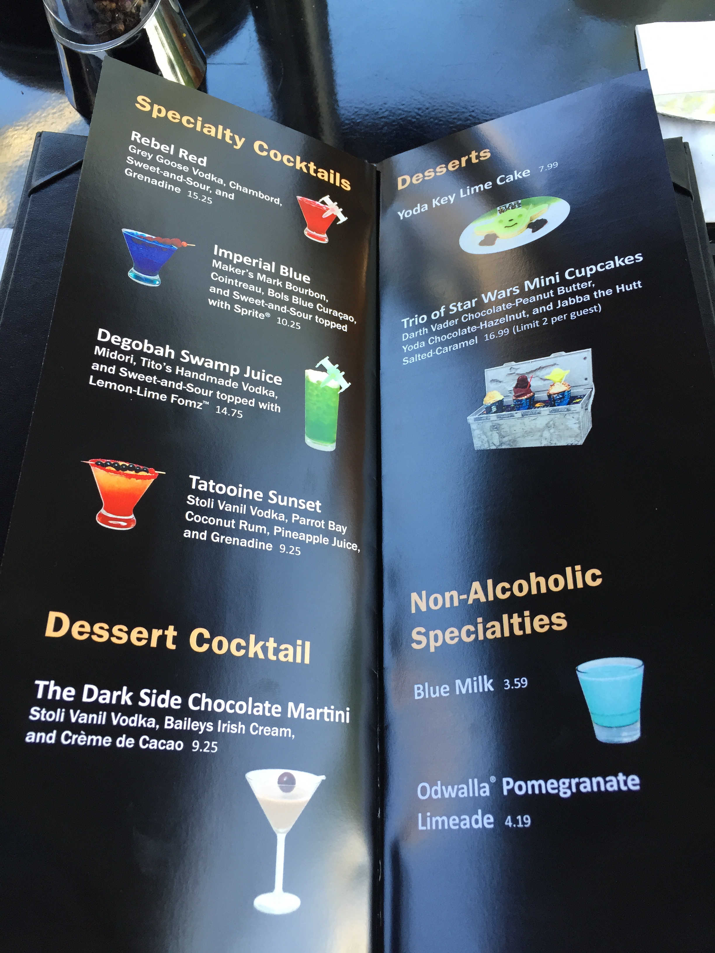 I didn’t realize that the Rebel Hangar was a sit-down restaurant. It is located at the Backlot Restaurant which is a typical Disney quick service restaurant. I assumed the Rebel Hangar would be the same. I jumped in line and then realized I was in line for reservations, oops. We checked out the menu and it looked awesome so we decided to splurge and go for it.